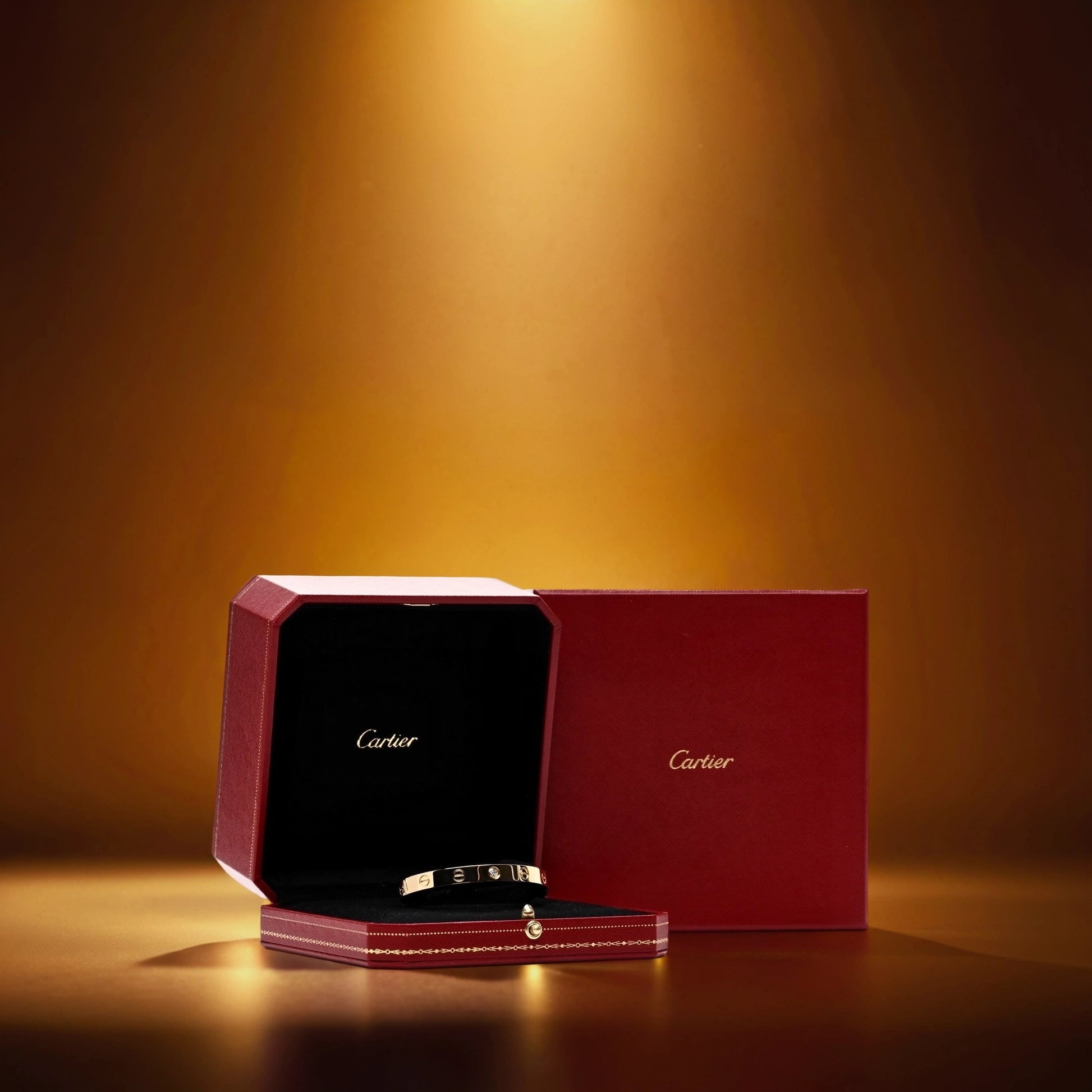 This is an authentic CARTIER 18K Yellow Gold 1 Diamond LOVE Cuff Bracelet 16. The bracelet is crafted of 18 karat yellow gold and features the iconic LOVE symbol motif with a single round brilliant diamond in the center, approximately .10 carats.
