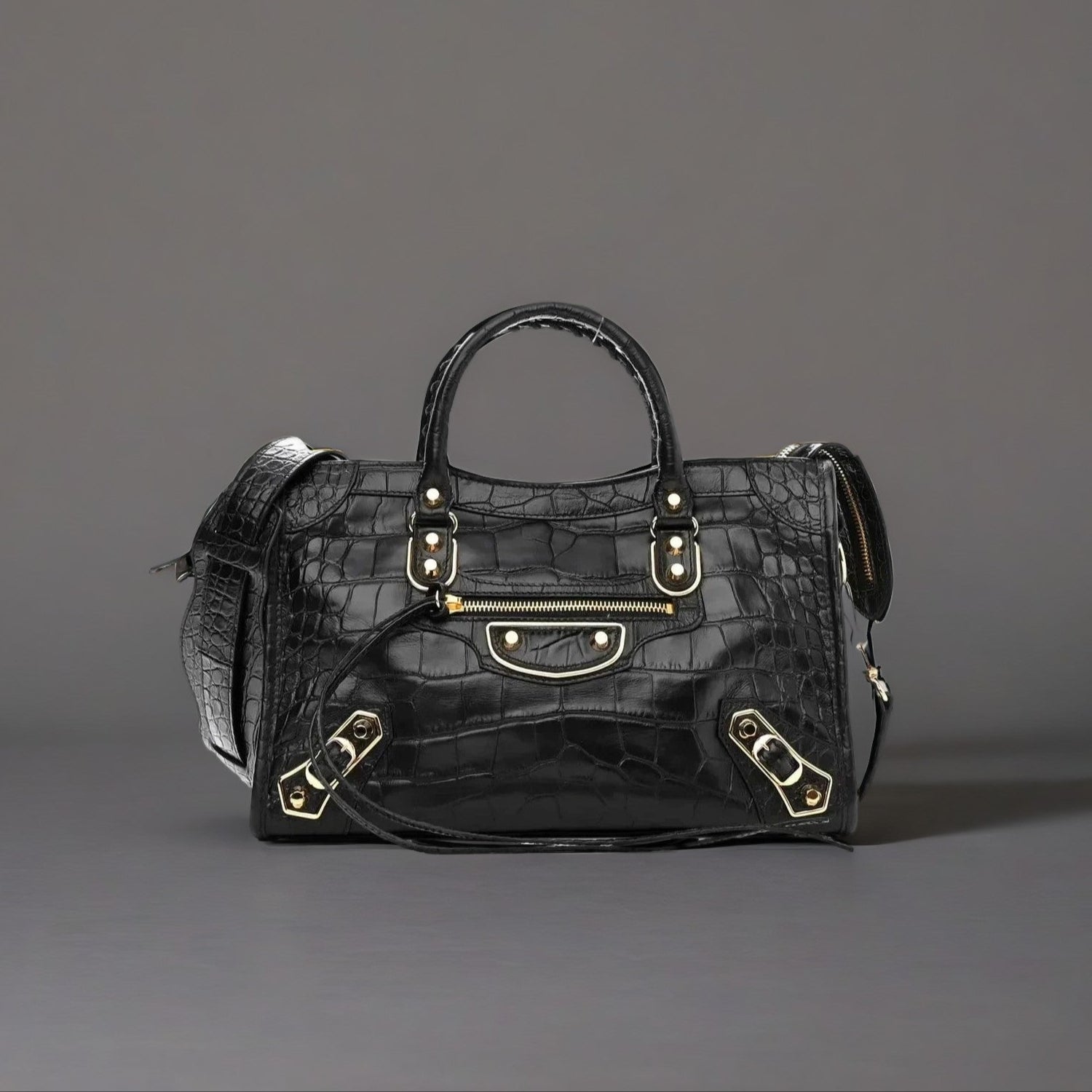 Calfskin Crocodile Embossed Gold Metallic Edge Hardware S City Black