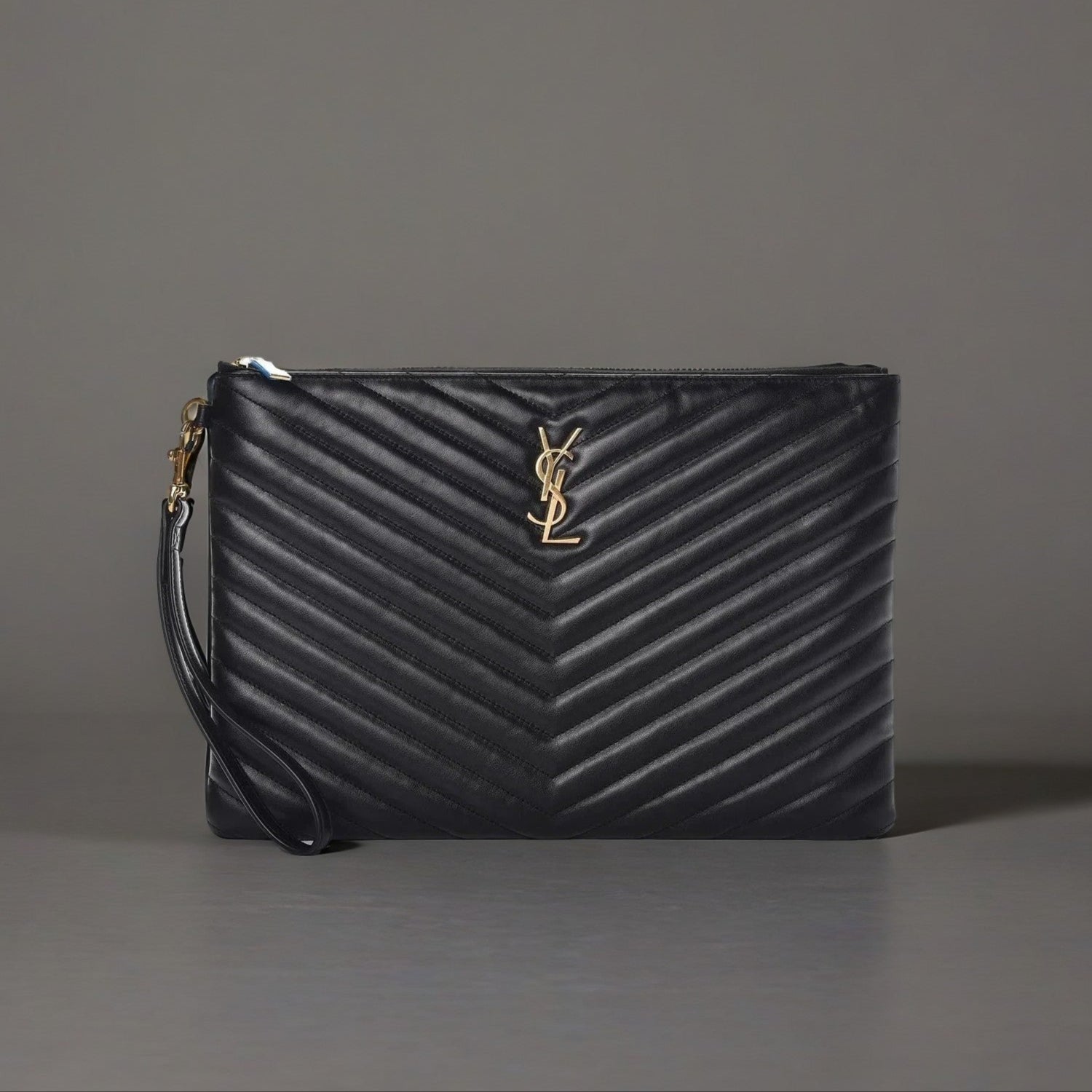 This is an authentic SAINT LAURENT Calfskin Matelasse Chevron Monogram Zip A4 Pouch in Black. This fabulous document holder is crafted of chevron quilted calfskin leather in black. It features a prominent gold YSL logo at the center. The top zipper opens to a black fabric interior with card slots and patch pockets. This classic piece is perfect for all your casual or professional needs, from Saint Laurent.