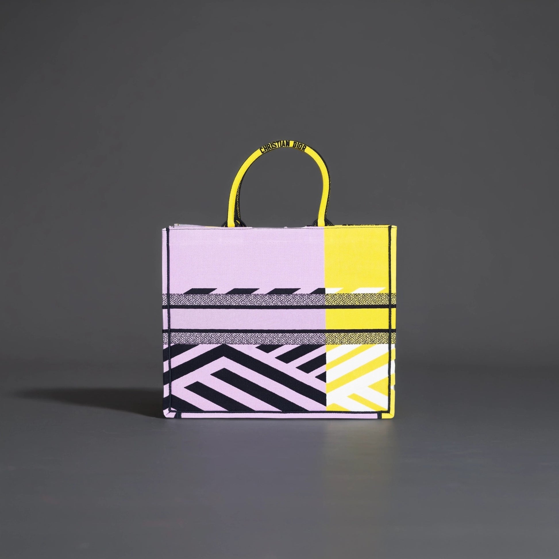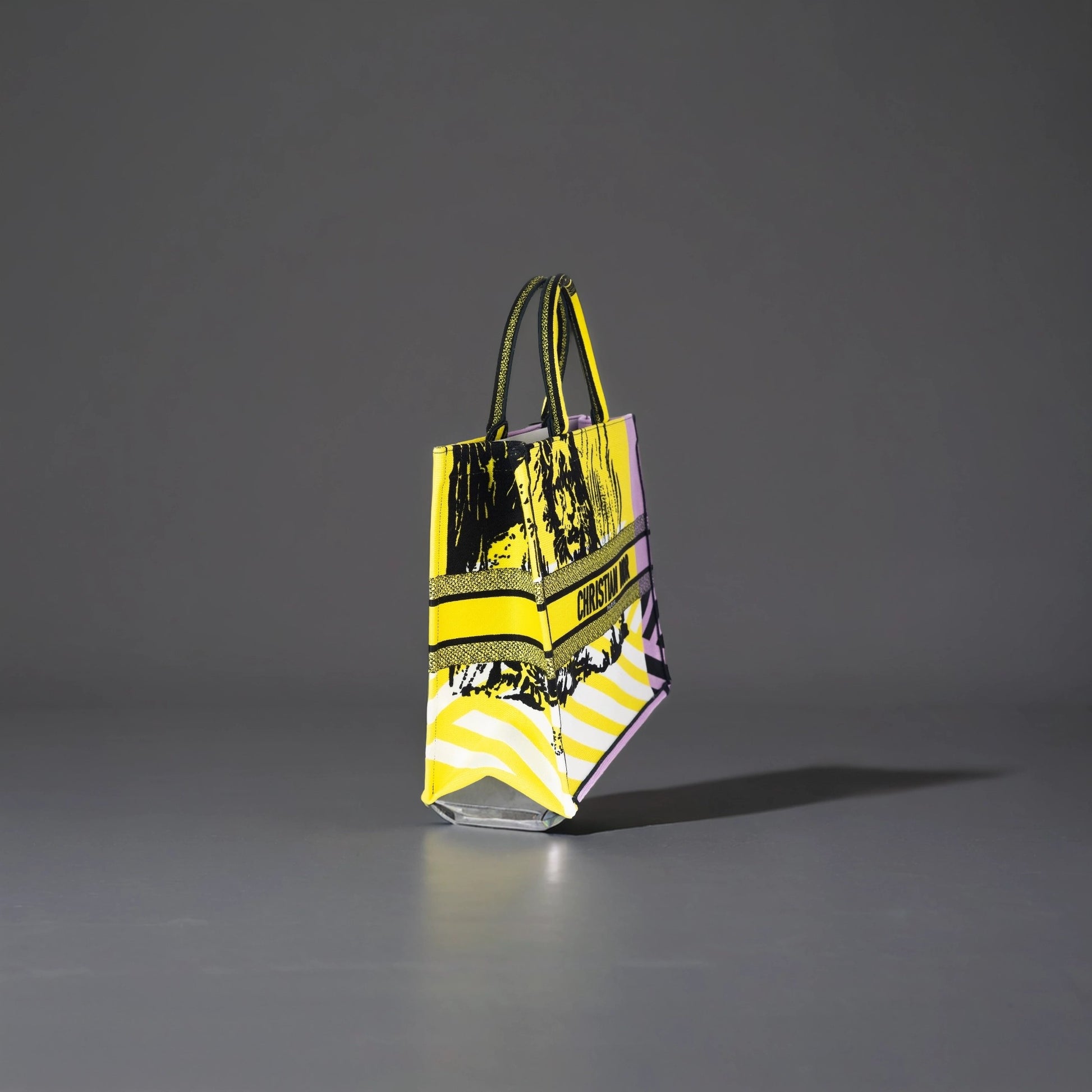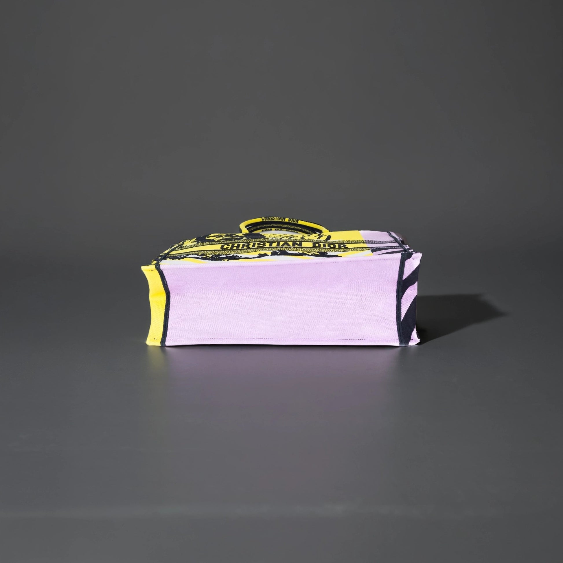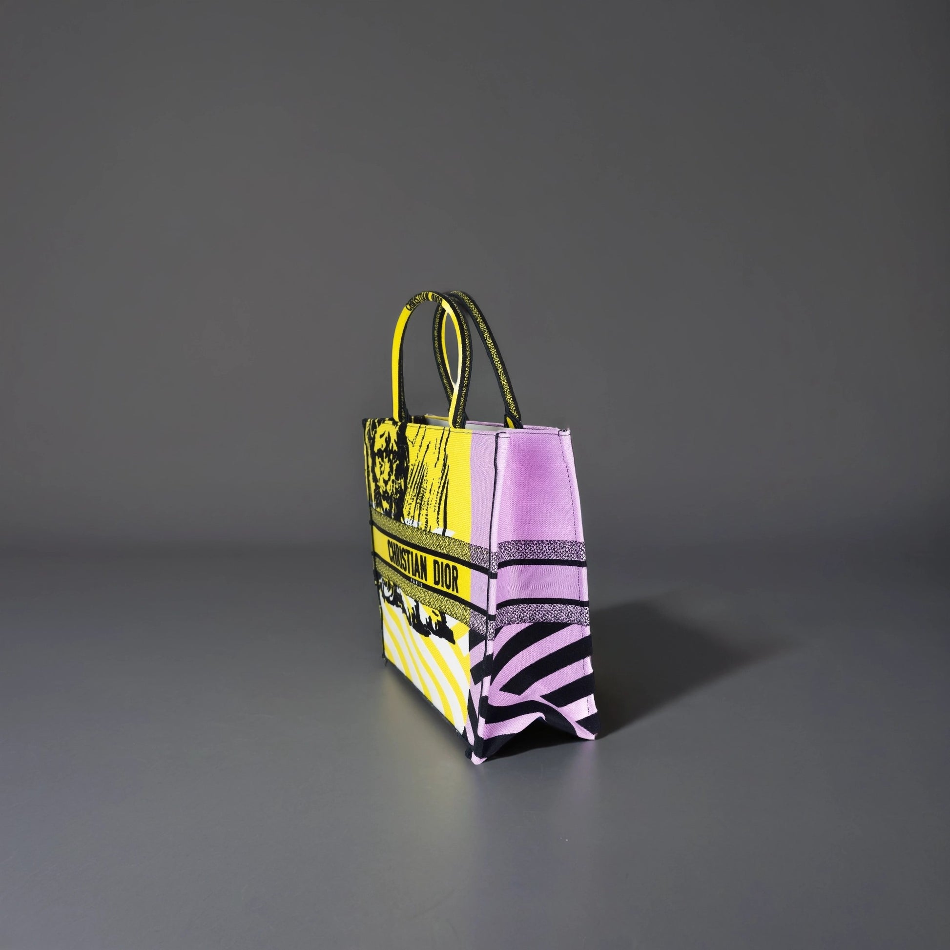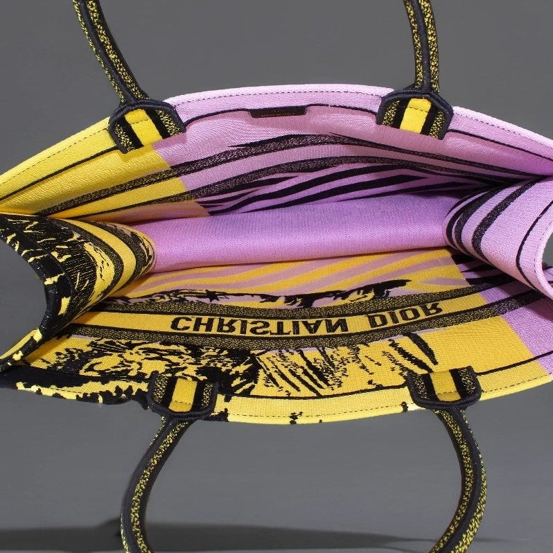 This is an authentic CHRISTIAN DIOR Canvas Embroidered Large Jungle Pop Book Tote in yellow and Multicolor. This tote is finely crafted of embroidered canvas with a bold and intricate design. The bag features matching canvas rolled handles and the CHRISTIAN DIOR logo embroidered across the front. The bag opens to a spacious fabric interior.