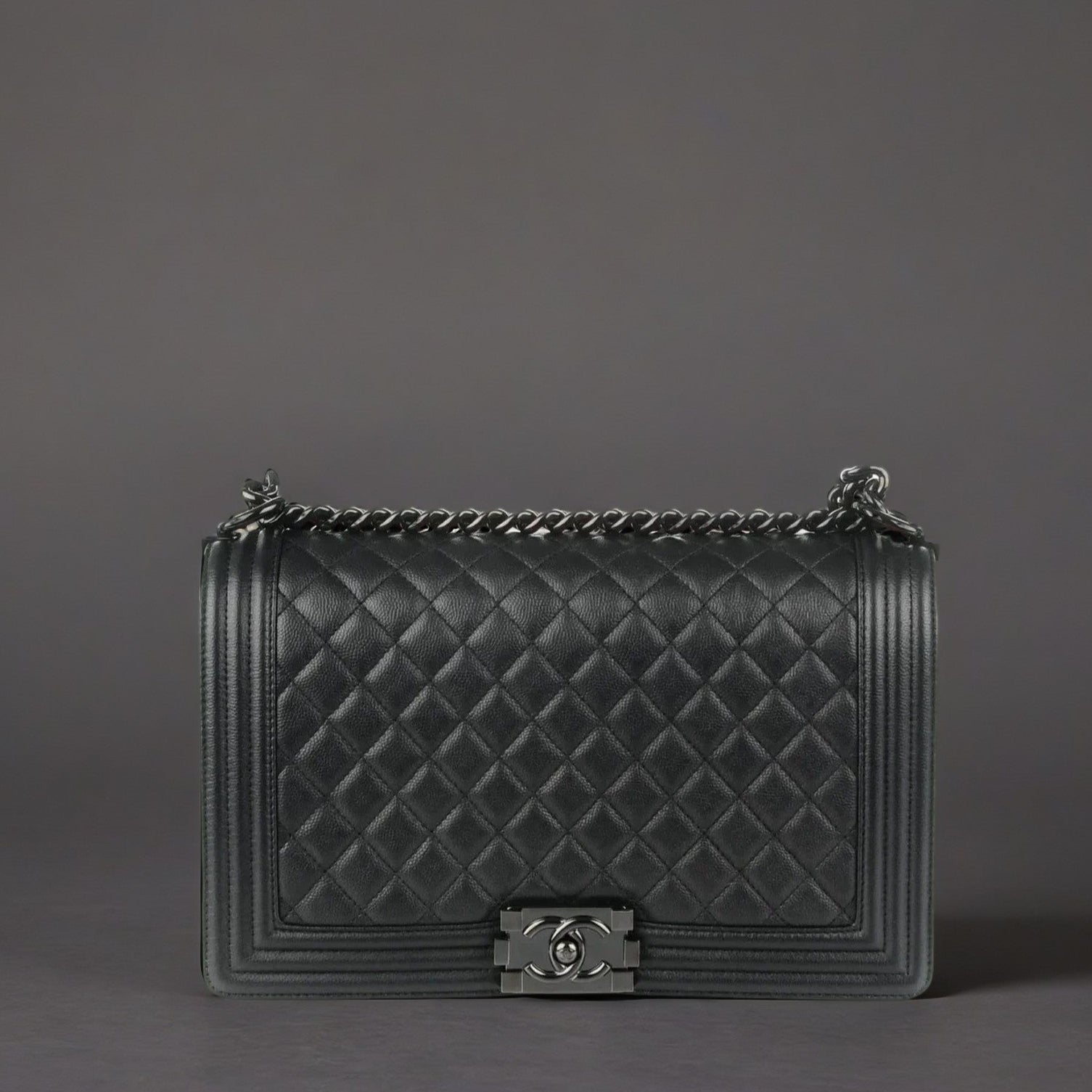 This is an authentic CHANEL Caviar Quilted New Medium Boy Flap in So Black. This stylish shoulder bag is crafted of luxurious iridescent grained lambskin leather in black framed by a linear quilting. The bag features a polished black chain link shoulder strap with a leather shoulder pad and a unique squared polished black Chanel CC press lock. The bag opens to a black fabric interior with a zipper pocket. This is a lovely shoulder bag, ideal for day and evening use, only from Chanel.