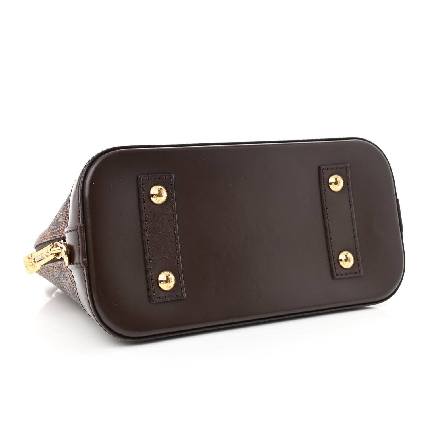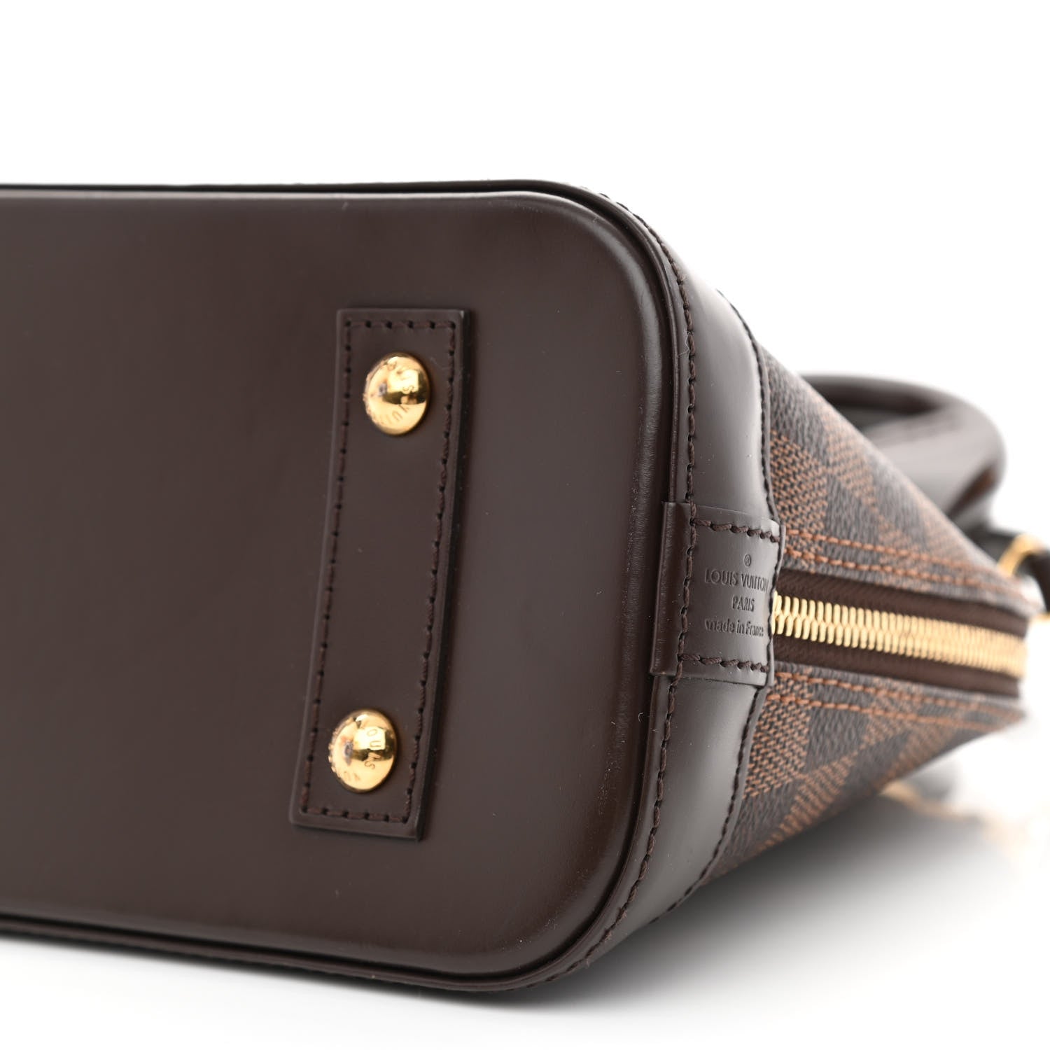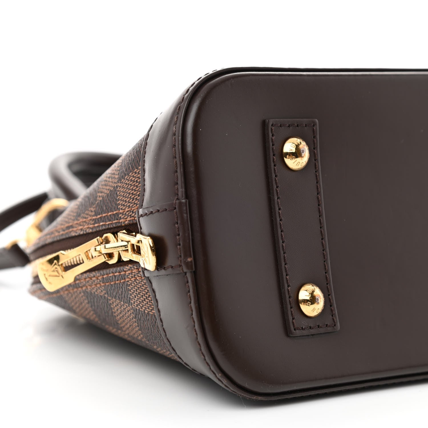 This is an authentic LOUIS VUITTON Damier Ebene Alma BB. This mini bowling-style handbag is crafted of Louis Vuitton's signature Damier coated canvas in brown. The bag features beautiful brown cowhide leather trim including a solid base, rolled top handles with brass hardware. The wrap-around zippers open to a red fabric interior with a patch pocket.