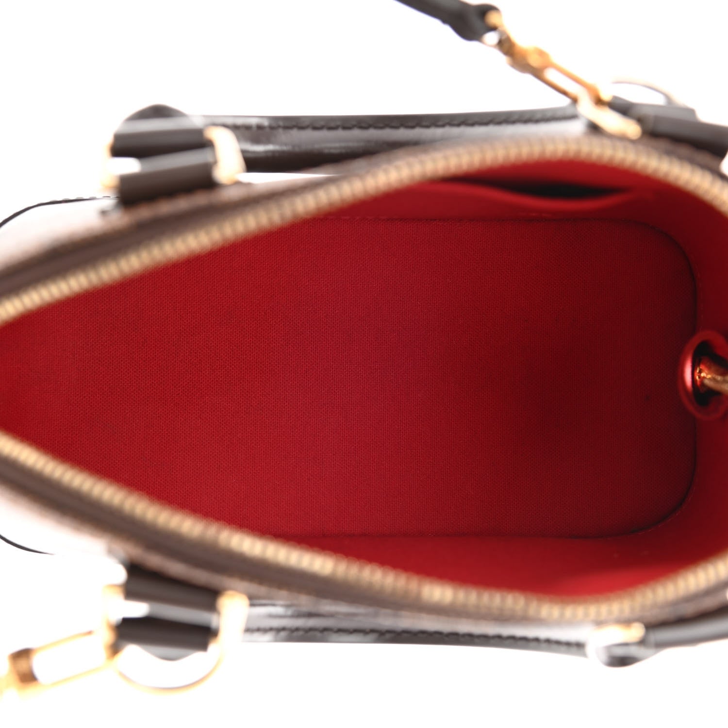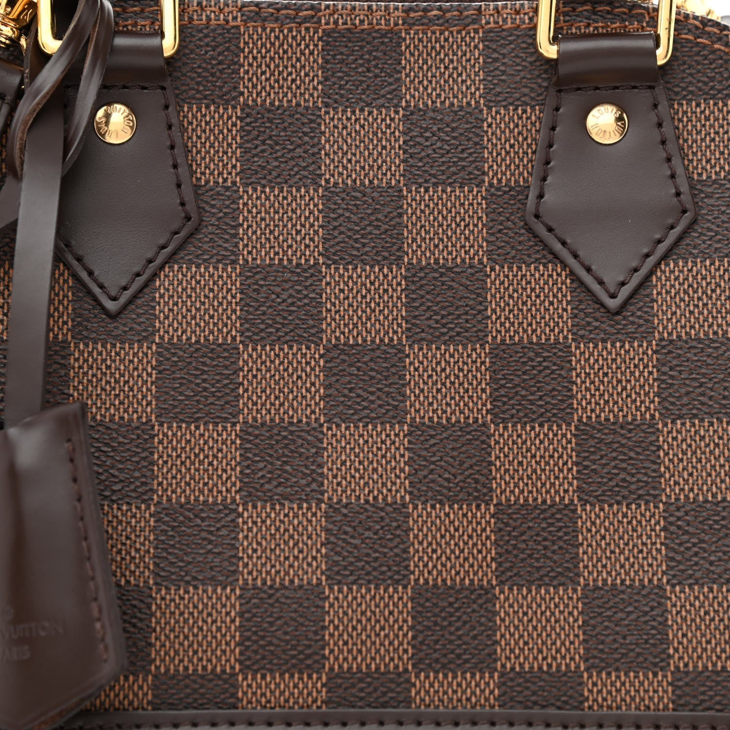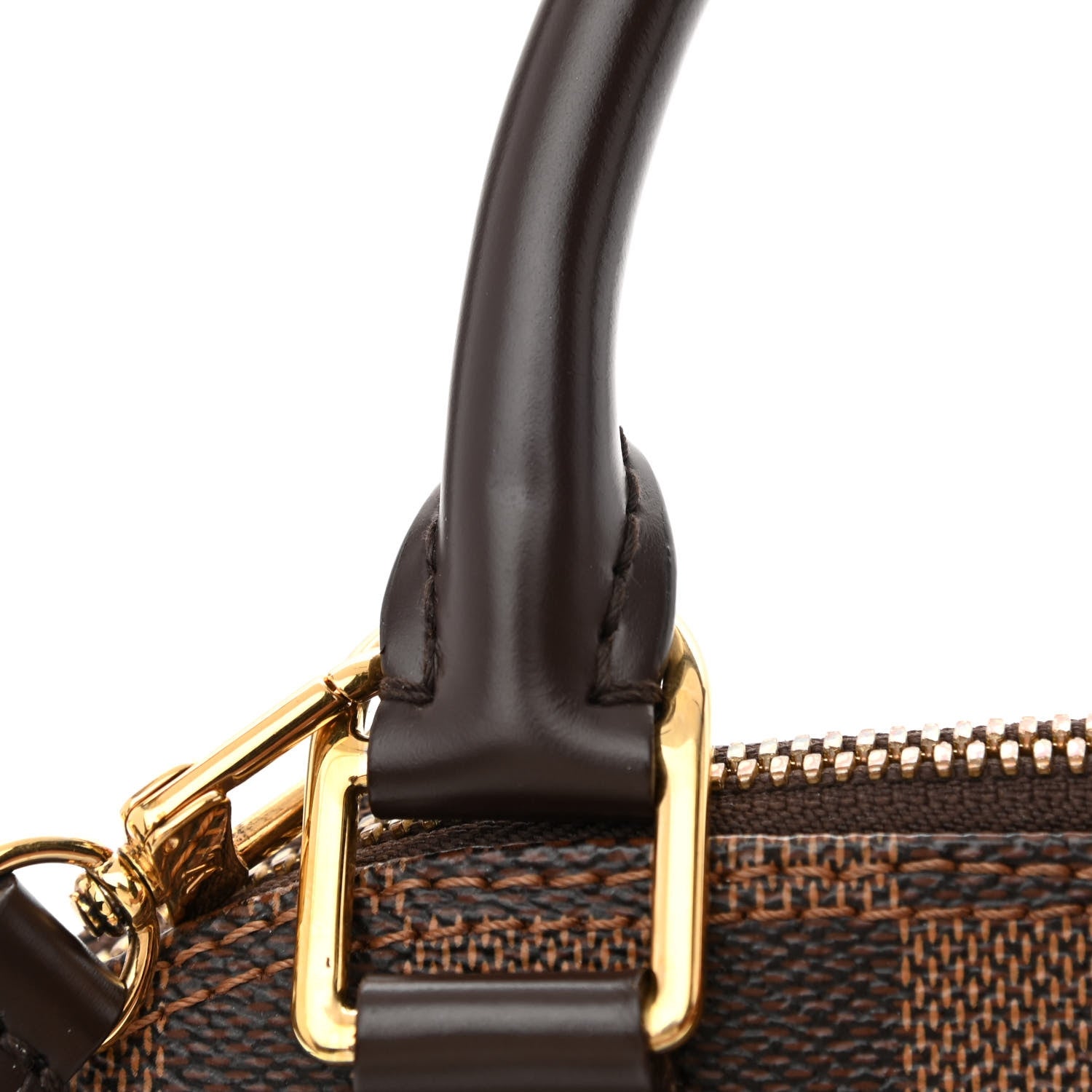 This is an authentic LOUIS VUITTON Damier Ebene Alma BB. This mini bowling-style handbag is crafted of Louis Vuitton's signature Damier coated canvas in brown. The bag features beautiful brown cowhide leather trim including a solid base, rolled top handles with brass hardware. The wrap-around zippers open to a red fabric interior with a patch pocket.