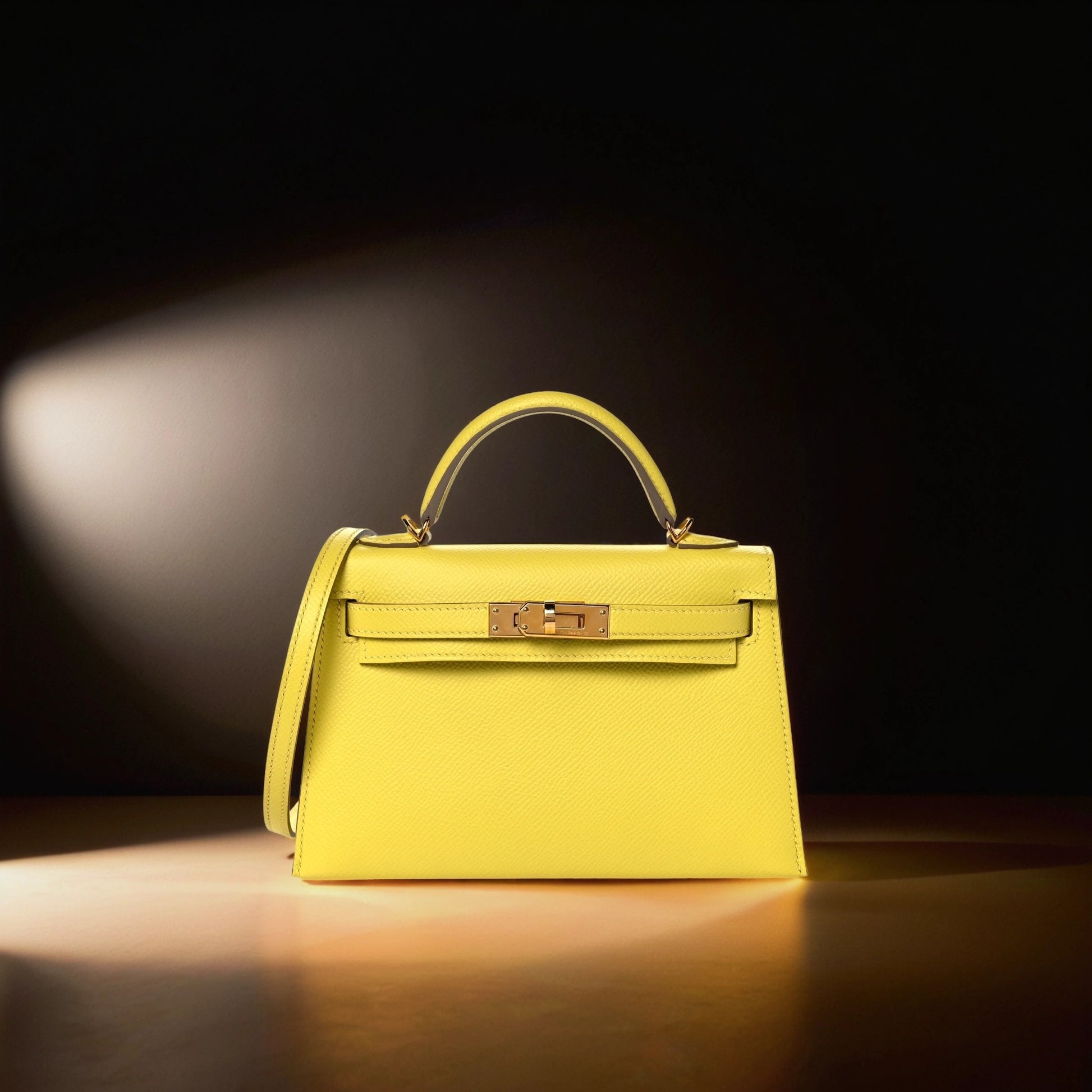This is an authentic HERMES Epsom Mini Kelly Sellier 20 in Lime. This stunning Hermes classic handbag is beautifully crafted in stamped Epsom calfskin leather in yellow. A single rolled leather top handle is secured with gold plated hardware and an optional leather shoulder strap is included. The traditional Kelly turn-lock secures the small flap. The interior features a matching chevre goatskin leather with a single flat pocket.