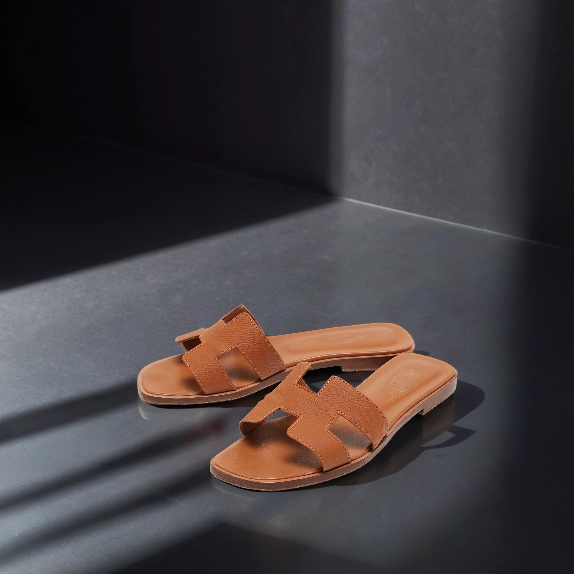 This is an authentic pair of HERMES Epsom Oran Sandals 40 in Gold. These stylish slippers are crafted of epsom calfskin leather in Gold. They feature a toe strap of a cross-over large Hermes H. These are casual sandals for everyday comfort with the classical sophistication of Hermes!