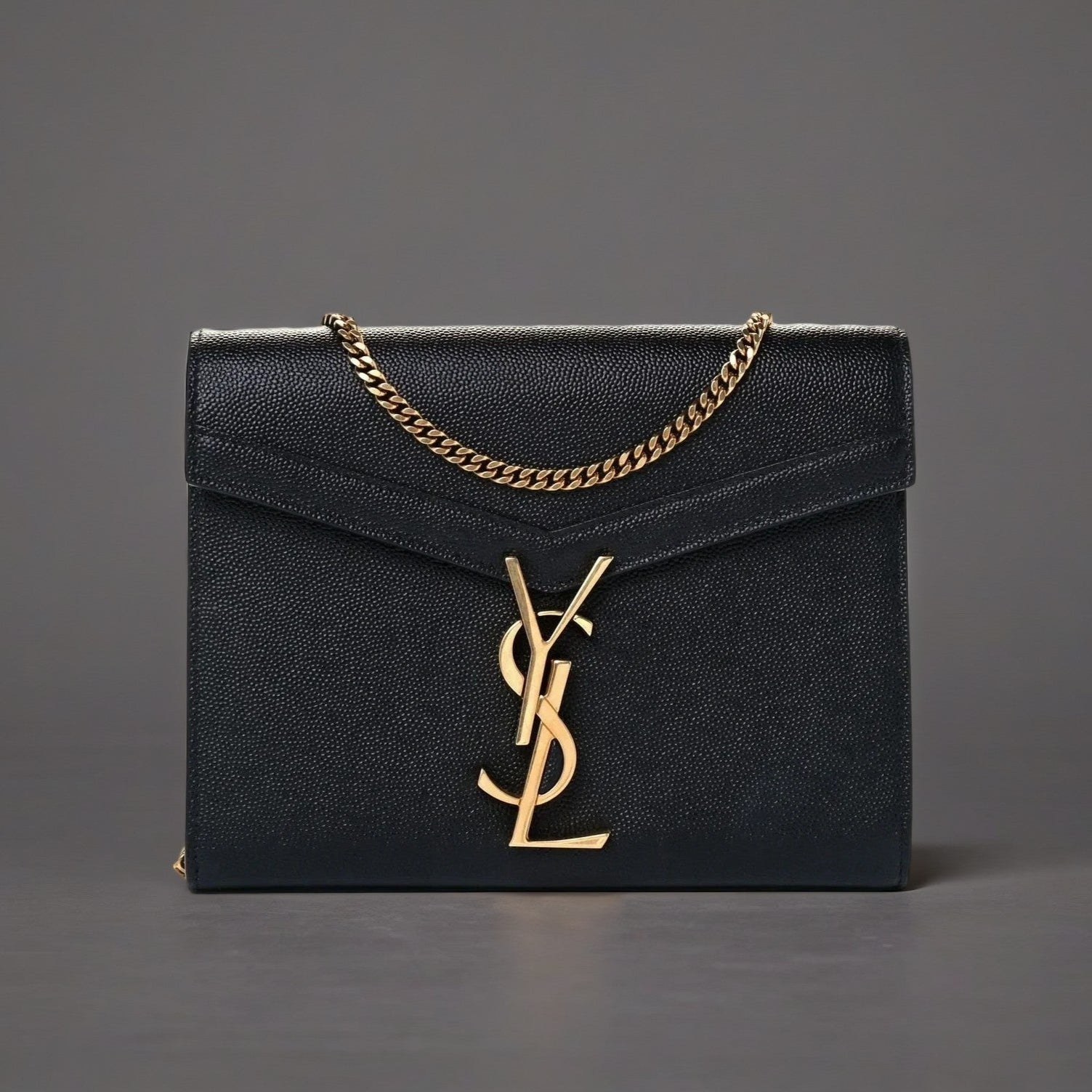 This is an authentic SAINT LAURENT Grain De Poudre Monogram Cassandra Chain Wallet in Black. This elegant wallet on a chain is crafted of finely pebbled calfskin leather in black. The shoulder bag features a hip-length gold chain shoulder strap with a classic gold interlocking YSL emblem on the flap. This opens to a black leather interior with a card slot panel, a zipper compartment, and patch pocket.