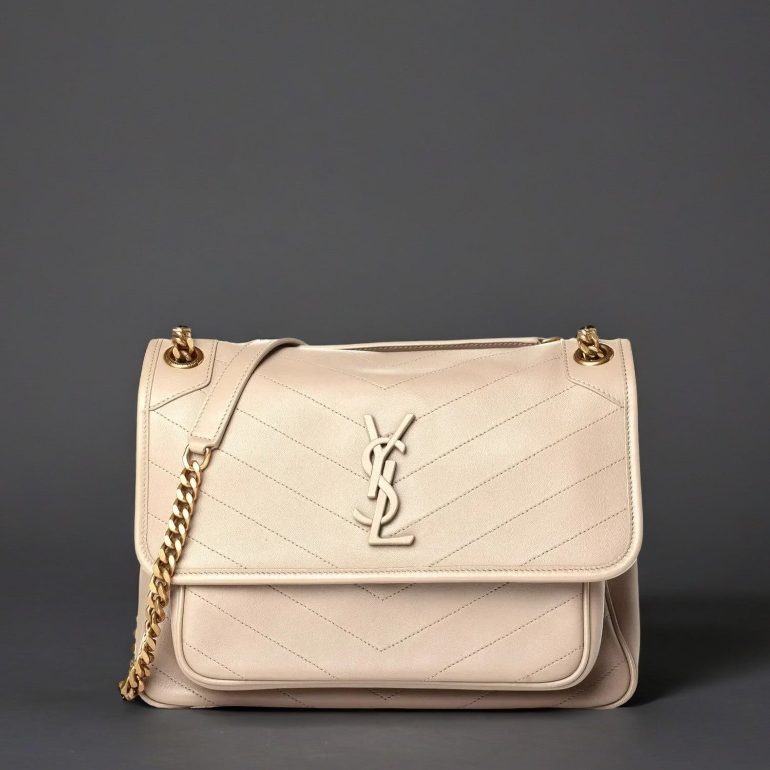 This is an authentic SAINT LAURENT Lambskin Matelasse Monogram Medium Niki Chain Satchel in Dark Beige. This elegant shoulder bag is crafted of chevron-quilted leather in beige. The bag features a ruthenium chain-link shoulder strap with matching leather shoulder pads. The front flap has a prominent YSL monogram detail and opens to reveal a front pocket and a black fabric interior with a zipper and patched pocket.
