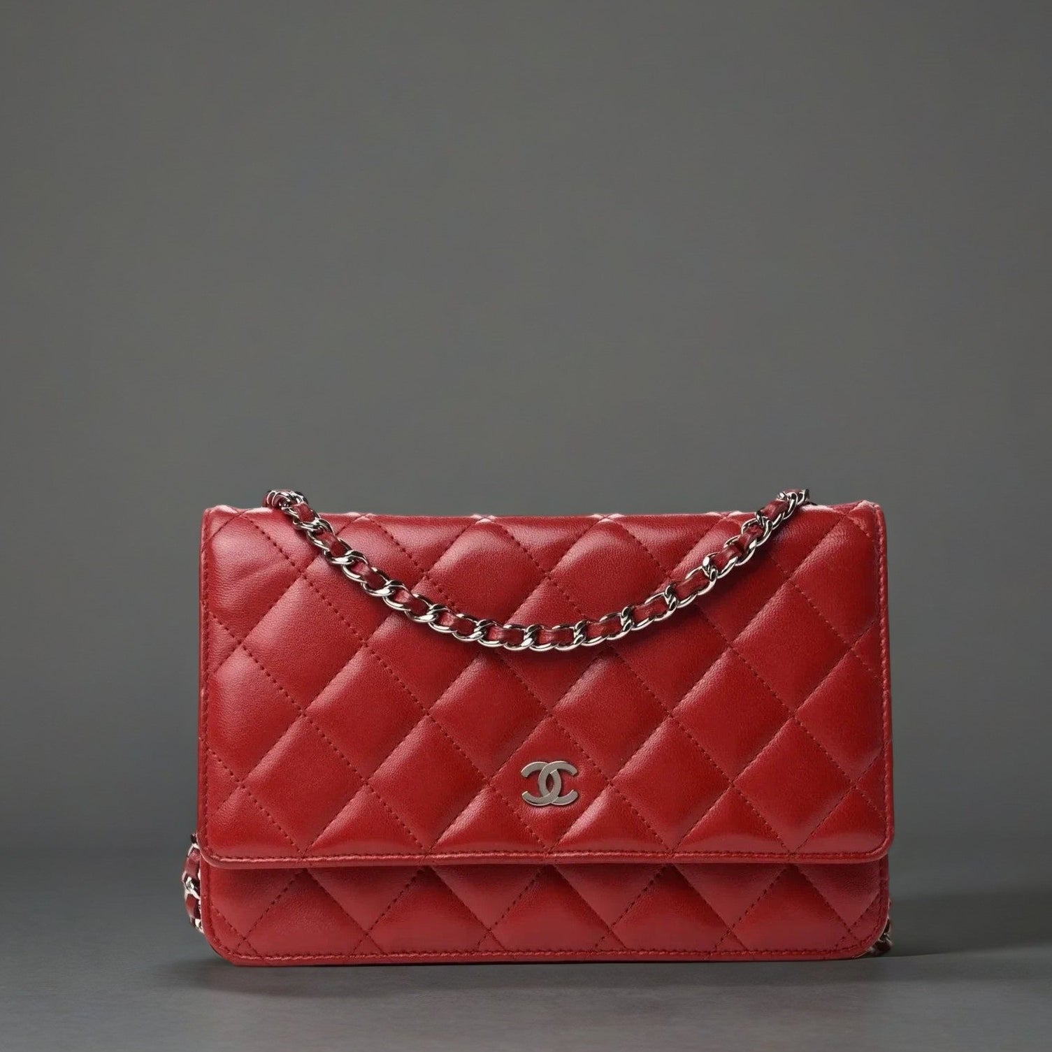 We guarantee this is an authentic CHANEL Lambskin Quilted Wallet on Chain WOC Red or 100% of your money back. This is a chic chain wallet that is crafted beautifully of diamond quilted lambskin leather in red. The bag features a silver chain-link leather threaded shoulder strap, a front flap with a small silver CC logo, and opens to an interior of red fabric with card slots, a patch pocket, and a zipper compartment.