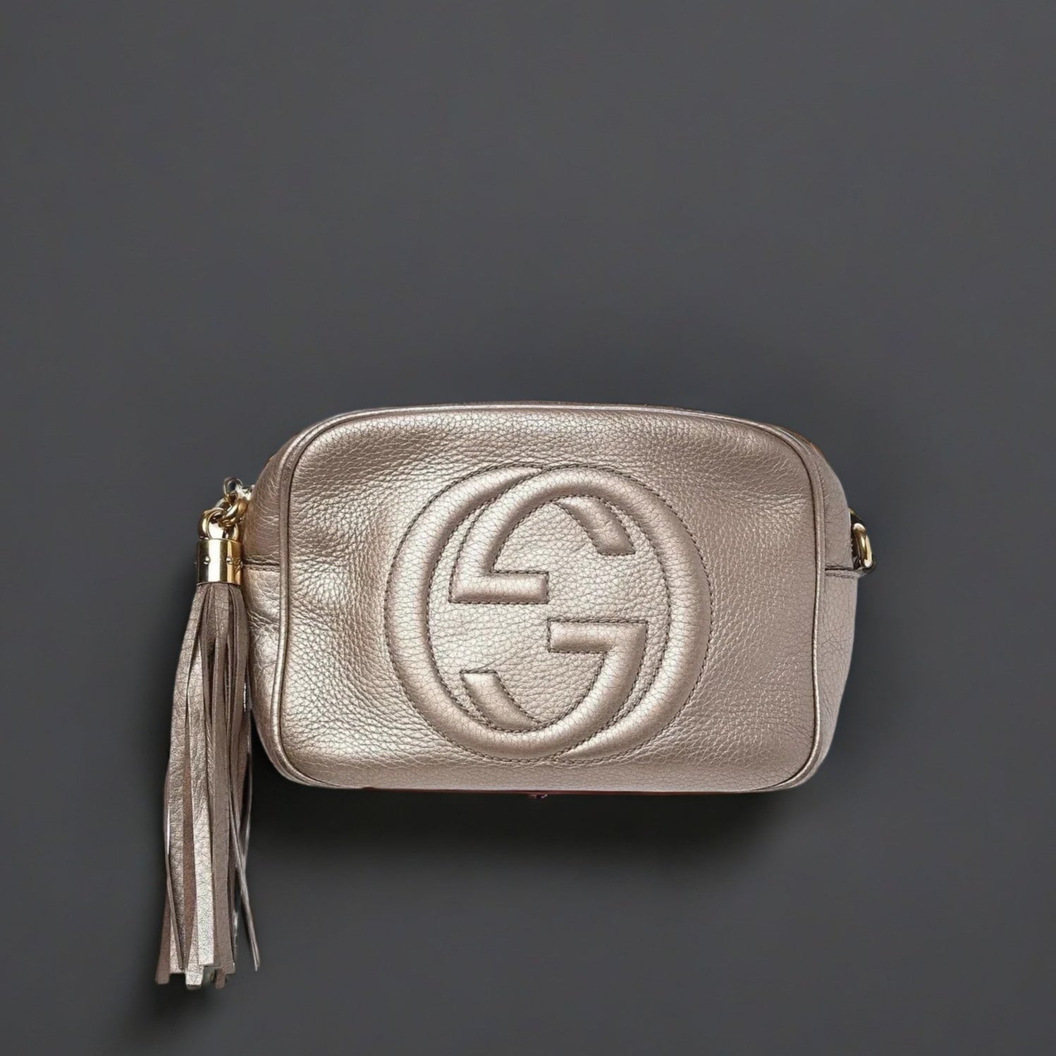 We guarantee this is an authentic GUCCI Metallic Pebbled Calfskin Small Soho Disco Bag Golden Beige. This stylish cross body bag is crafted of textured calfskin leather in golden grey. The shoulder bag features an adjustable leather shoulder strap, a stitched interlocking GG logo and a gold knobbed leather tassel zipper pull. This opens to an ivory natural fabric interior with a patch pocket. This is a classic everyday bag, only from Gucci.