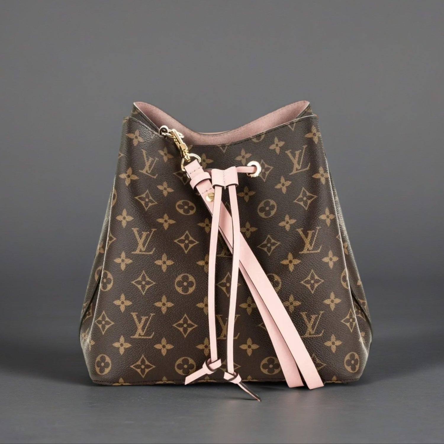 This is an authentic LOUIS VUITTON Monogram Neonoe in Rose Poudre. This classic bucket style shoulder bag is crafted of Louis Vuitton monogram on coated canvas. The shoulder bag features a light pink shoulder strap and top cinch strap with polished brass hardware. This opens to a soft pink microfiber interior and monogram canvas center zip pocket to keep you organized. This fresh take on their classic bucket bag is sure to turn heads, from Louis Vuitton.