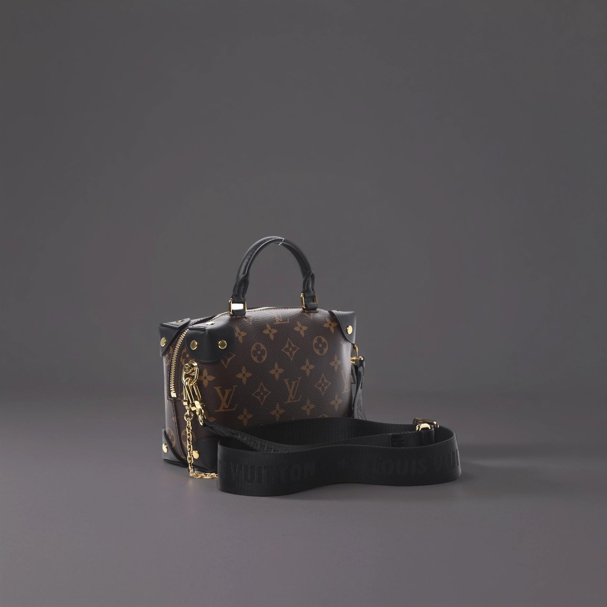 This is an authentic LOUIS VUITTON Monogram Petite Malle Souple in Black. This stylish handbag is crafted of Louis Vuitton monogram coated canvas, with black leather corner details. The bag features a rolled leather top handle, a polished gold chain shoulder strap, and an adjustable black canvas shoulder strap, with polished gold hardware. The top zipper opens to a black microfiber interior with a zipper pocket.