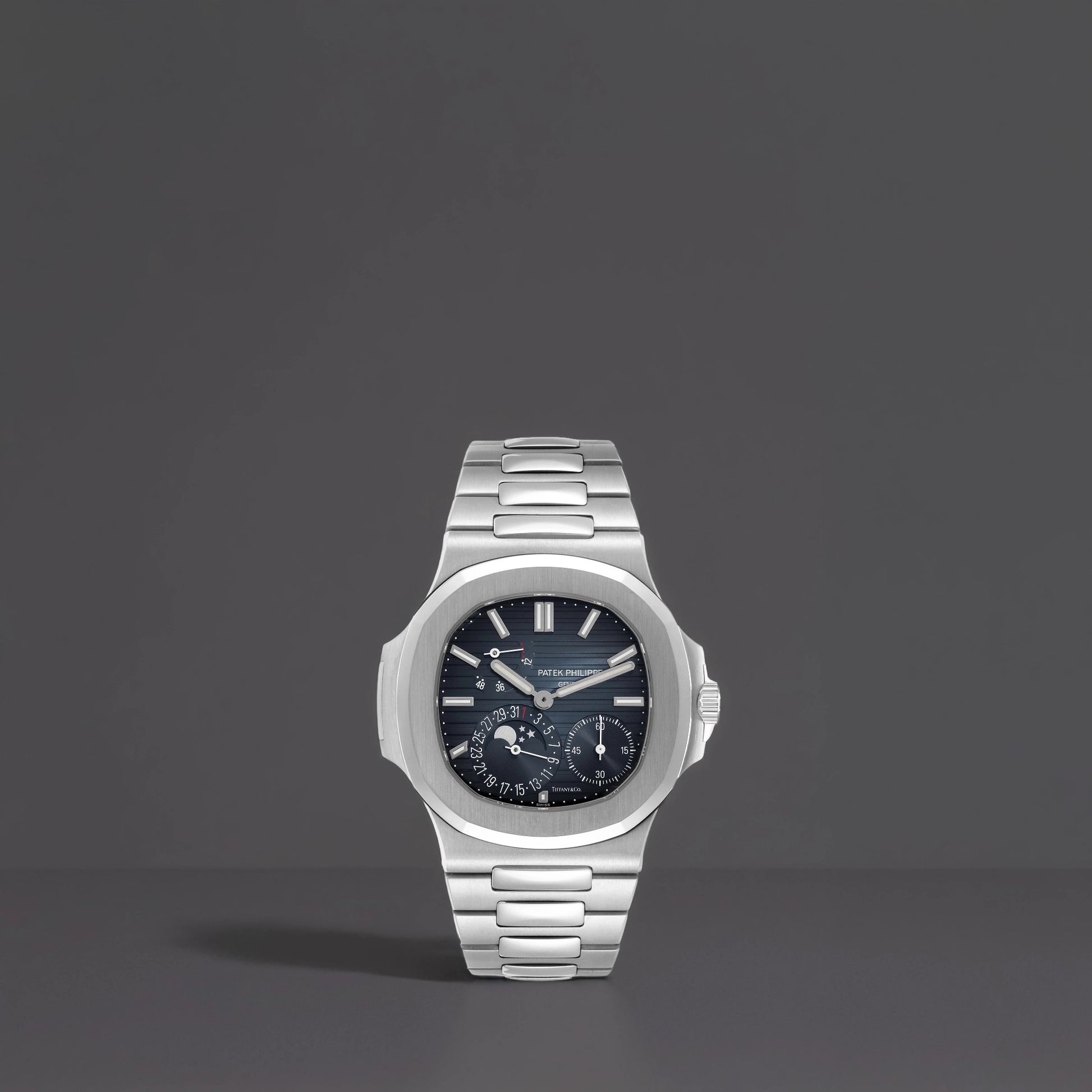 Patek Philippe Nautilus Tiffany Edition Stainless Steel Mens Watch. Automatic self-winding movement. Ultra-thin, Patek Philippe Caliber 240 PS IRM C LU beats at 21,600 vph, contains 29 jewels, composed of 265 parts with a 48-hour power reserve. Stainless cushion-shaped case 40.0 x 40.0 mm. Transparent exhibition sapphire crystal caseback. Patek Philippe logo on the crown. Crown guard. Stainless Steel gold smooth "porthole" bezel. Scratch resistant sapphire crystal. Blue gradient, horizontal embossed, dial with applied luminescent white gold baton hour markers and hands. Small seconds subdial at 4 o'clock. Moonphase and date indicator at 7 o'clock. Power reserve display located between 10 and 11 o'clock. Subtle "Tiffany&Co" signature stamped on the dial above 5 o'clock. Stainless steel bracelet with a double deployant clasp
