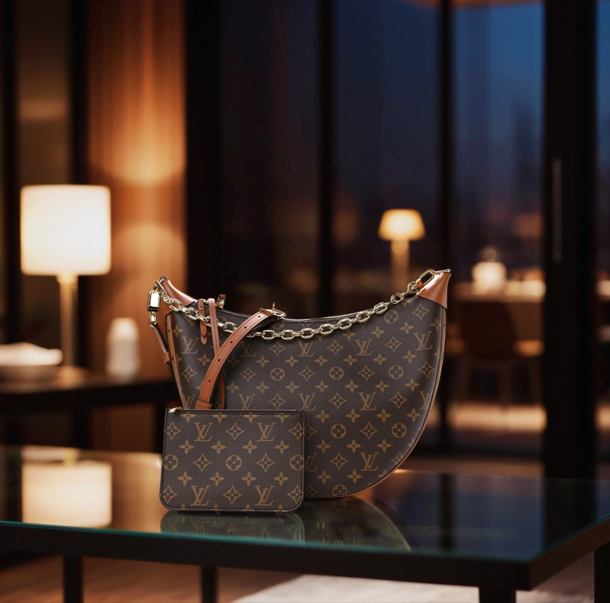 This is an authentic LOUIS VUITTON Reverse Monogram Loop Hobo. This stylish bag is crafted of Louis Vuitton monogram-coated canvas. This shoulder bag features an optional gold chain strap, an adjustable leather shoulder strap, and gold hardware. The top zipper opens to a brown fabric interior.