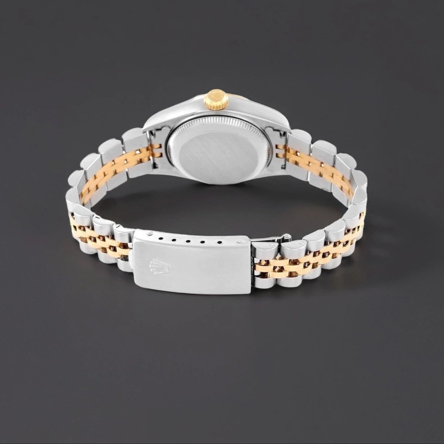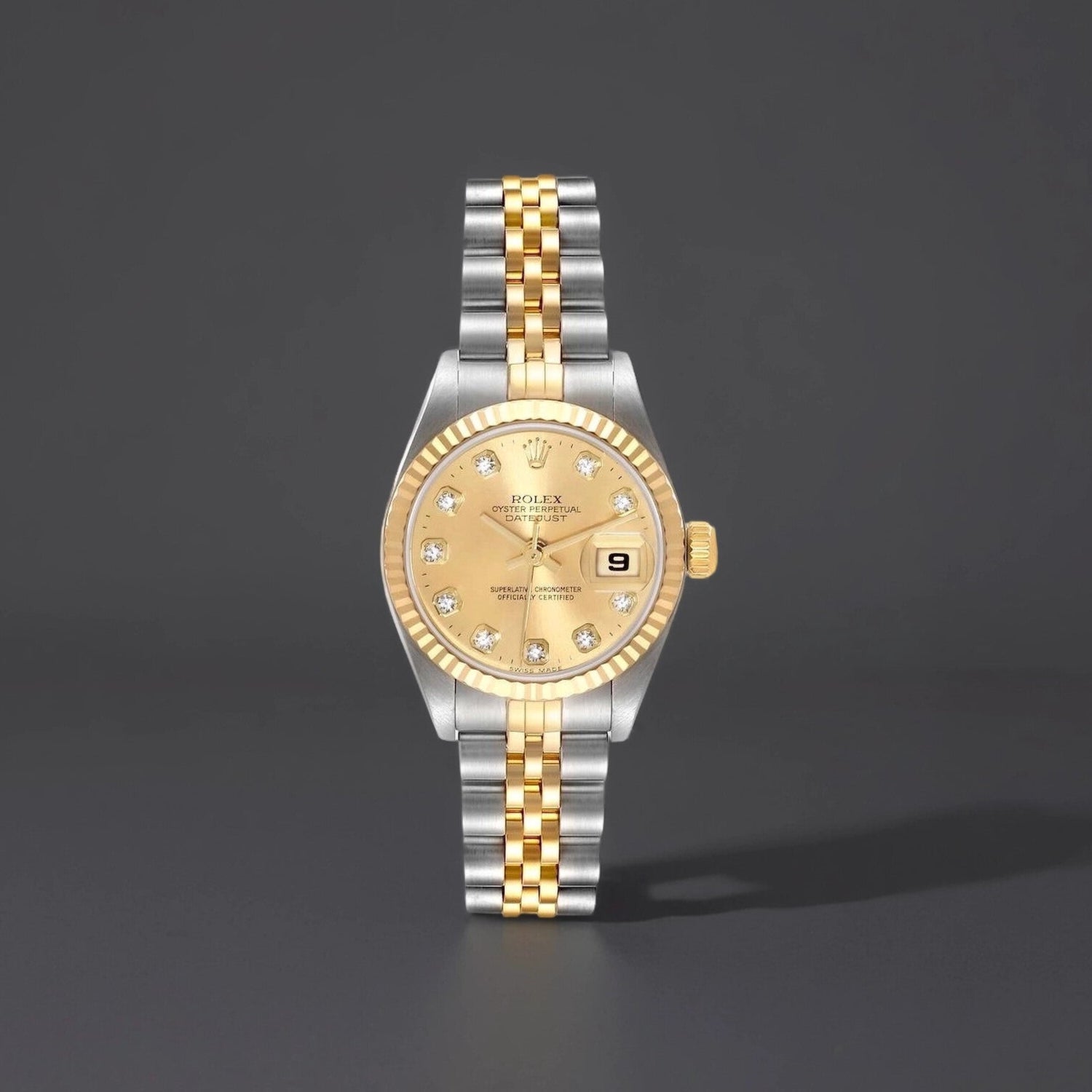 Rolex Datejust Steel Yellow Gold Diamond Dial Ladies Watch. Stainless steel oyster case 26 mm in diameter. Rolex logo on an 18K yellow gold crown. 18k yellow gold fluted bezel. Scratch resistant sapphire crystal with cyclops magnifier. Champagne dial with original Rolex factory diamond hour markers. Date calendar at 3 o'clock aperture. Stainless steel and 18k yellow gold jubilee bracelet with a fold over clasp