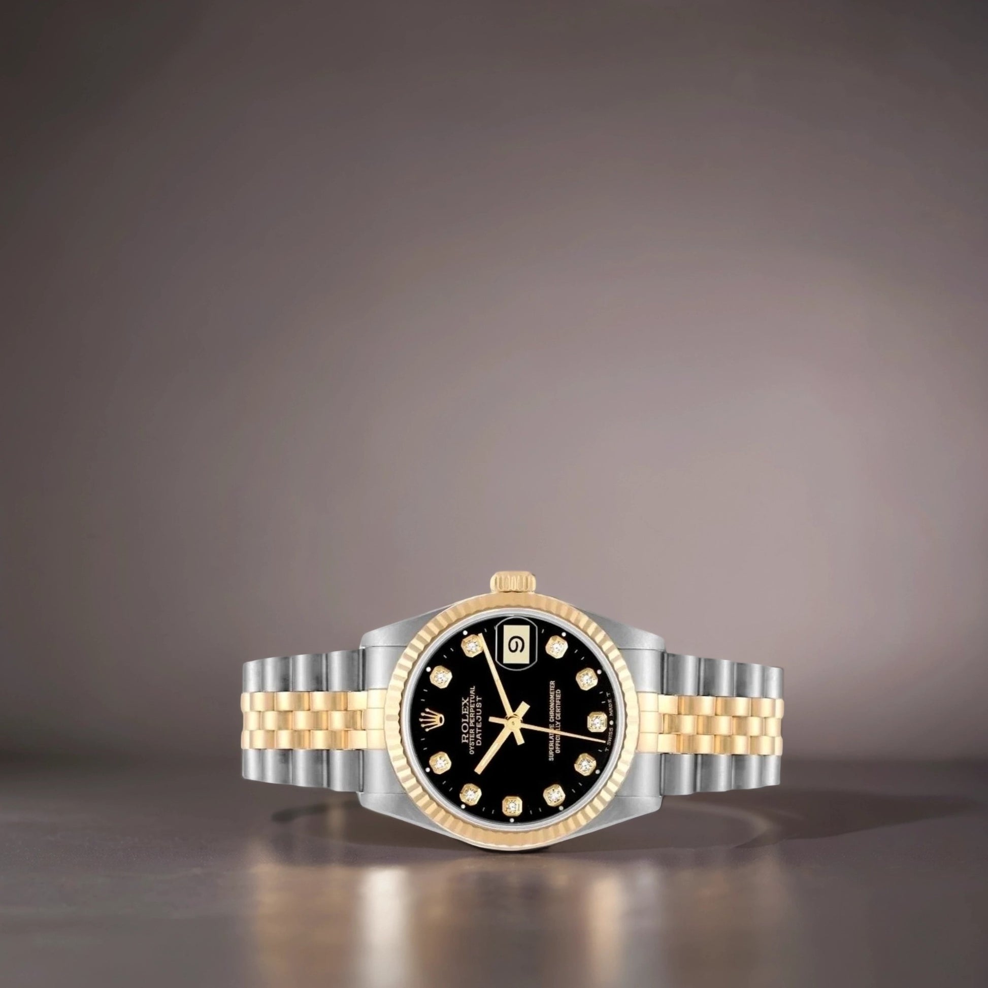 Rolex Datejust Midsize Diamond Steel Yellow Gold Ladies Watch. Stainless steel oyster case 31 mm in diameter. Rolex logo on an 18k yellow gold crown. 18k yellow gold fluted bezel. Scratch resistant sapphire crystal with cyclops magnifier. Black dial with original Rolex factory diamond hour markers. Date calendar at 3 o'clock aperture. Stainless steel and 18k yellow gold jubilee bracelet with fold over clasp.