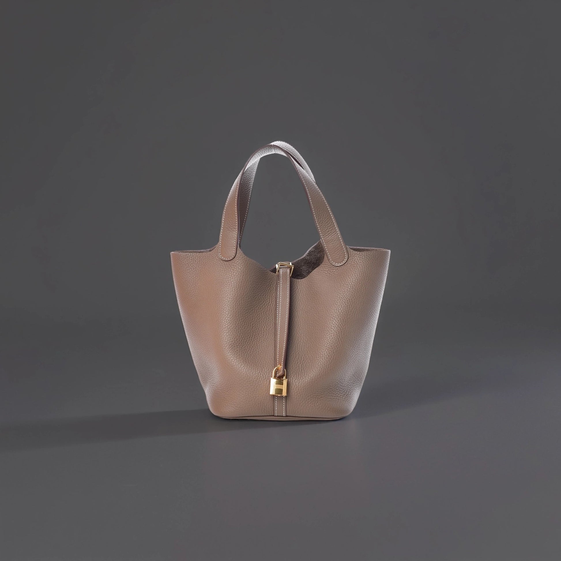 This is an authentic HERMES Taurillon Clemence Picotin Lock 22 MM in Etoupe. This stunning tote is crafted of luxuriously soft clemence calfskin leather in taupe, in a relaxed bucket style, featuring gold hardware. The bag features a unique one piece reinforced design with leather top handles and a thin cross over strap. The top is open to a suede and leather interior. This is an excellent tote for everyday wear, both practical and chic, from Hermes!