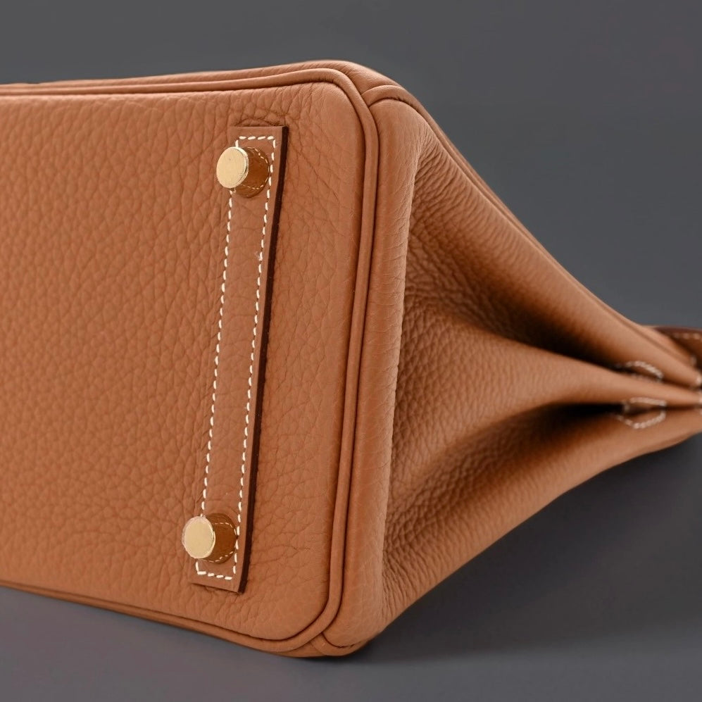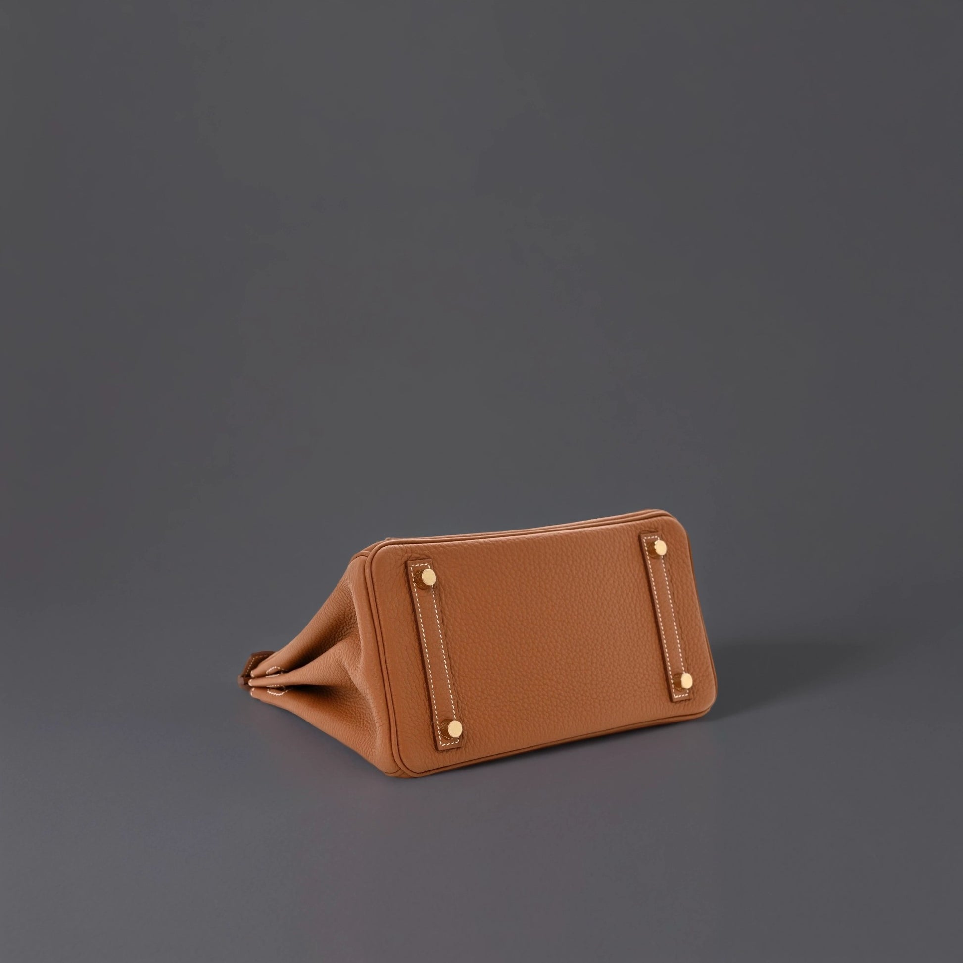 This is an authentic HERMES Togo Birkin 25 in Gold. This classic handbag is beautifully crafted of togo calfskin leather in golden brown. The bag features rolled leather top handles, a short front flap and strap closure, and gold-plated hardware including a padlock and keys inside a leather clochette. This opens to a goatskin leather interior with zipper and patch pockets.