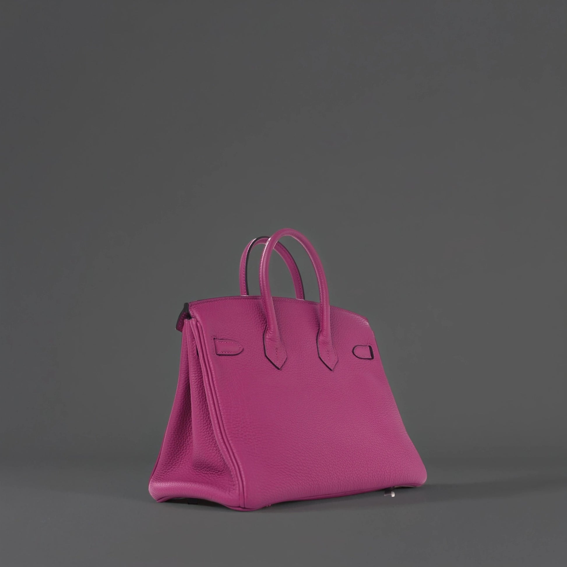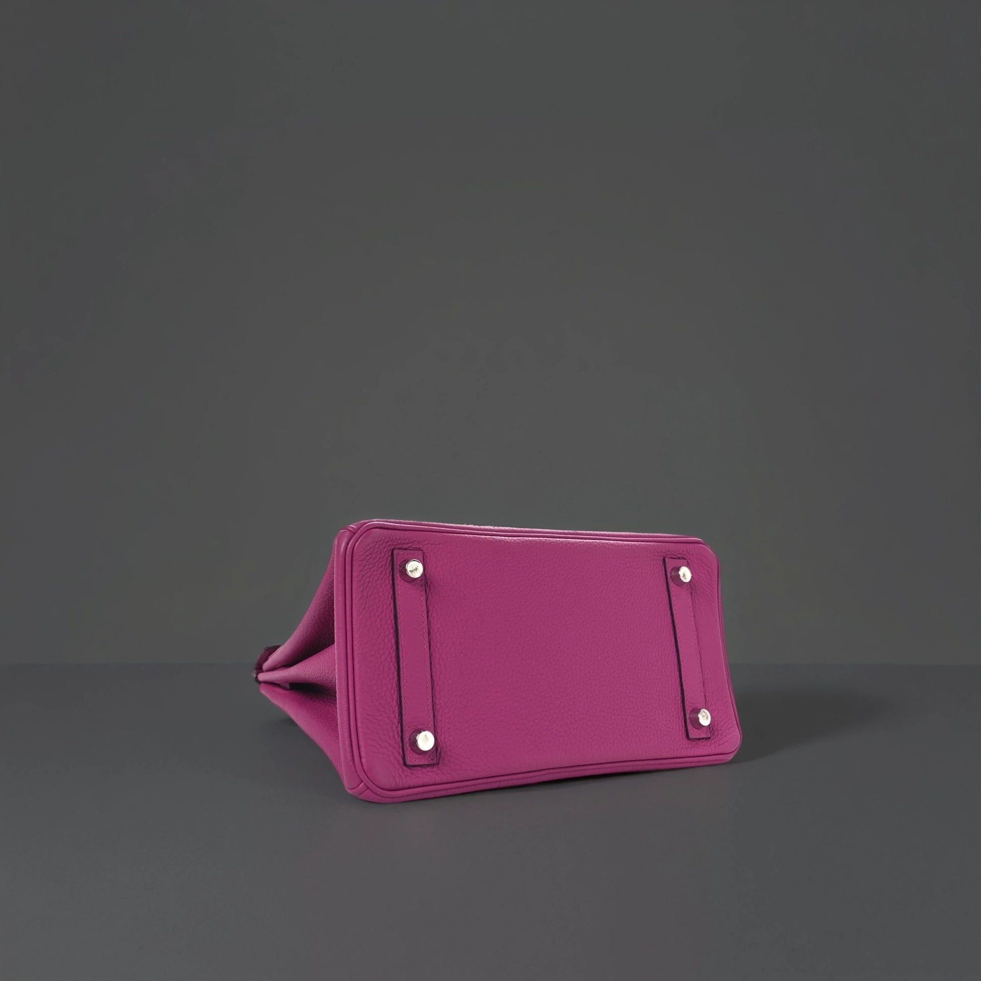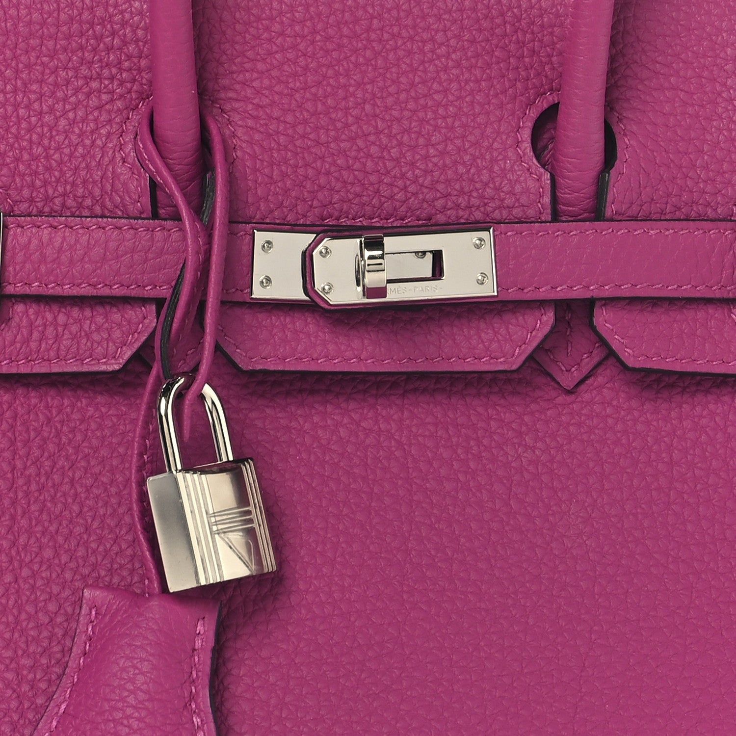This is an authentic HERMES Togo Birkin 25 in Rose Pourpre. This sought after color is featured in a classic Birkin, crafted of rich purple grained calfskin leather. The bag features rolled leather top handles and palladium hardware. The top opens to reveal a matching goatskin leather interior, featuring a zipper and patch pockets.